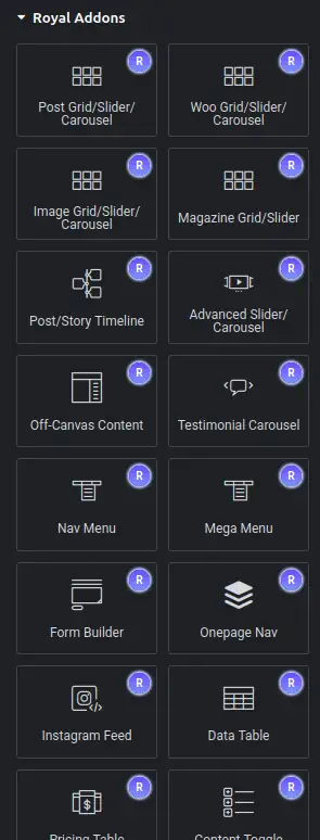 Cette extension nécessite d’abord d’installer l’extension Elementor pour pouvoir l’utiliser. Une fois installé et activé, les blocs vont apparaître dans la fenêtre de création d’Elementor avec un R visible pour « Royal Addon for Elementor ».